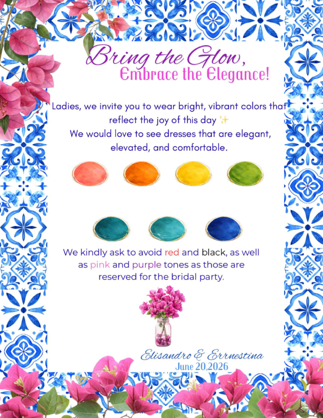 You are invited to wear vibrant, rich, and sophisticated colors that reflect celebration and distinction. We kindly ask that you avoid pastel tones, black, red, and magenta or fuchsia shades, as these colors are reserved for the bridal party. Deep tones and elegant prints inspired by the warmth and beauty of Mexico are especially encouraged.